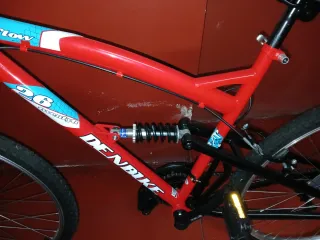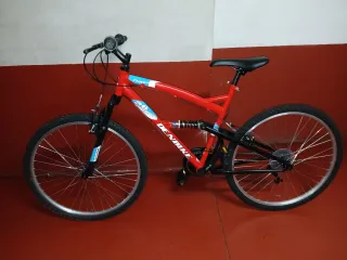 Bicicleta de montaña Denbike Flow con ruedas de 26 pulgadas. - Color rojo vibrante. - Diseño de doble suspensión (delantera y trasera). - Manillar y sillín negros. - Cuadro de aluminio. - Frenos de disco. - Cambio Slimano de 21 velocidades. NO SE ENVIA.