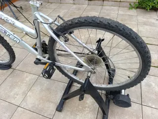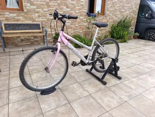 Bicicleta de montaña en color rosa, ideal para entrenamientos en casa. - Incluye rodillo para entrenamiento. - Rueda delantera con soporte. - Manillar negro. - La rueda de delante está pinchada - Fácil de montar y desmontar del rodillo, gracias a unas tuercas adaptadas que le he puesto a la rueda trasera