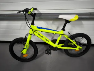 Bicicleta infantil de 16 pulgadas, marca Atractor, en color amarillo brillante. Ideal para los más pequeños. - Cuadro de acero resistente. - Ruedas de 16 pulgadas. - Frenos delanteros y traseros. - Sillín ajustable en altura. - Diseño llamativo con detalles en azul. - Se entrega con ruedines