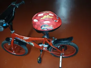 NO SE ENVIA Set de bicicleta infantil y casco a juego con diseño de Rayo McQueen. - Bicicleta de color rojo con detalles de Rayo McQueen. - Incluye casco protector a juego. - Ruedines de apoyo para principiantes.