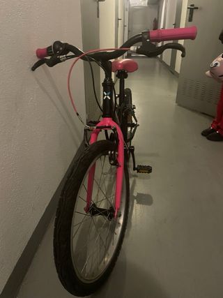 Bicicleta infantil Btwin con un diseño llamativo en color rosa y negro. - Cuadro de metal. - Ruedas de 20 pulgadas. - Sillín y puños rosas. - Pedales amarillos.
