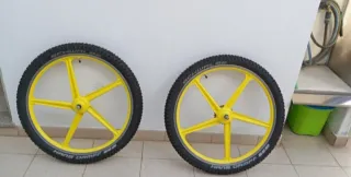 Juego de dos llantas Grimeca de 26 pulgadas con un llamativo diseño en color amarillo. - Llantas de 26 pulgadas. - Diseño de 5 radios. - Color amarillo brillante. - Neumáticos Schwalbe Hans Dampf incluidos.