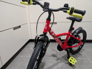 Bicicleta infantil B'TWIN Racing 900 de 16 pulgadas, ideal para niños. - Cuadro de aluminio ligero. - Diseño deportivo en color rojo. - Ruedas de 16 pulgadas. En muy muy buen estado por escaso uso.a Solo está algo desgastado los mandos de frenar de roce que se ve en la foto. Dejo característica en foto. Comprada en decathlon por 199€.