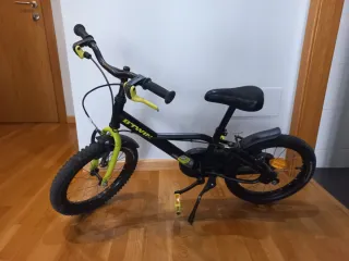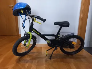 Bicicleta infantil B'TWIN en color negro y detalles en verde y amarillo. Incluye casco azul. - Ruedas de 16 pulgadas. - Frenos de mano. - Sillín ajustable. - Incluye casco de protección.