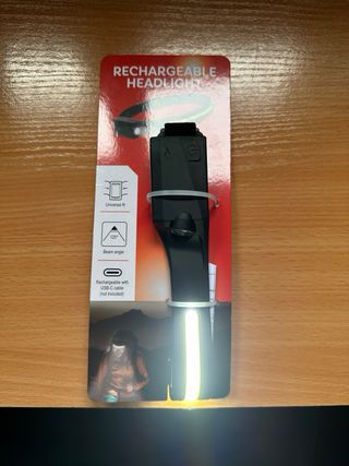 Linterna frontal recargable con diseño moderno y funcional. - Ajuste universal. - Ángulo de haz de 120°. - Recargable con cable USB-C (no incluido).