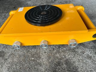 Patin de transporte de color amarillo brillante, ideal para mover cargas pesadas. - Construcción robusta de metal. - Plato giratorio superior con recubrimiento de goma. - Ruedas resistentes para facilitar el desplazamiento.