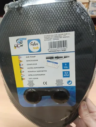 Hinchador de pie de la marca Safari Sub, con una capacidad de 5 litros. - Modelo: Hinchador Pie 5 L Sport - Presión máxima: 0,5 ATM - Incluye adaptadores para diferentes válvulas.