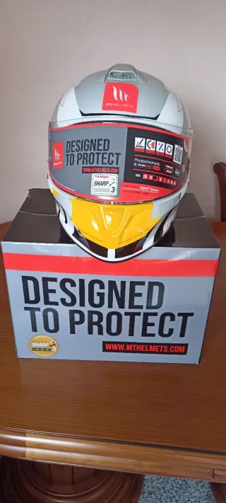 Casco de moto MT Targo Pro con diseño en blanco y amarillo. Presenta la certificación SHARP 3 estrellas. - Visera fotocromática. - Cierre de seguridad. - Interior cómodo.