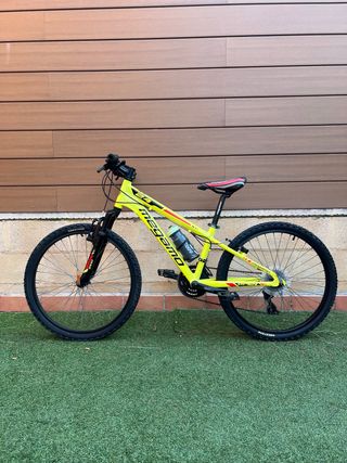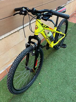 Bicicleta de montaña Megamo en color amarillo, ideal para jóvenes ciclistas. - Cuadro de aluminio. - Ruedas de 24 pulgadas. - Frenos de disco. - Suspensión delantera. - Cambio Shimano.