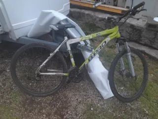 Bicicleta de montaña lista para usar. - Cuadro de bicicleta de montaña. - Rueda delantera de bicicleta de montaña.