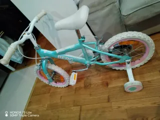 Bicicleta infantil marca Berg, modelo Missy, en color azul turquesa y blanco. Ideal para los más pequeños. - Ruedines incluidos. - Diseño llamativo con detalles en rosa. - Sillín blanco ajustable.
