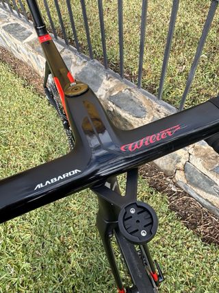 Bicicleta de carretera con un diseño llamativo. - Cuadro de bicicleta de carretera. - Marca - Color negro con detalles en amarillo y rojo.