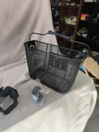 Cesta de malla metálica negra para bicicleta. - Diseño abierto y resistente. - Asa para facilitar el transporte. - Placa frontal con detalles.