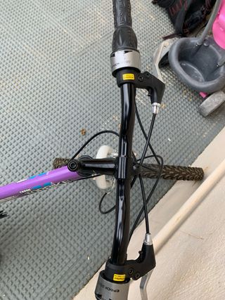 Bicicleta de montaña con cuadro morado. - Manillar negro. - Frenos delanteros y traseros. - Rueda delantera con cubierta de tacos.