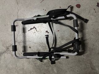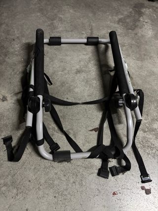 Portabicicletas para coche, diseñado para transportar bicicletas de forma segura. - Estructura metálica resistente. - Correas de sujeción incluidas. - Compatible con la mayoría de vehículos. -Tiene la espuma en uno de los lados un poco rota pero no afecta a su uso.