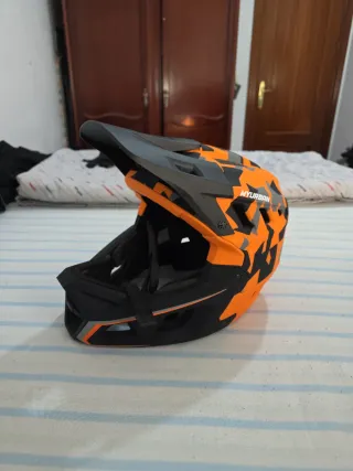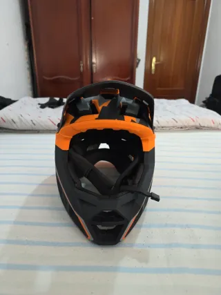 Casco integral con diseño llamativo en naranja y negro. - Talla L. - Visera ajustable. - Sistema de ventilación.
