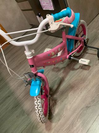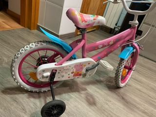 Bicicleta infantil de color rosa con diseño de Peppa Pig. Ideal para los más pequeños. - Ruedines de apoyo incluidos. - Guardabarros delantero y trasero. - Sillín y manillar decorados.