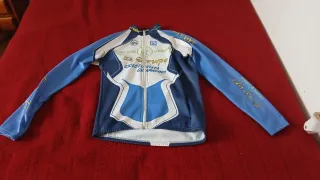 Maillot de ciclismo de manga larga con un diseño llamativo en tonos azules y blancos. - Diseño frontal con el logo El Grupo Cicloturista Granadino. - Mangas de color azul claro. - Cierre de cremallera completo en la parte delantera. - Inscripción CALOR VERDE en las mangas.la chaqueta azul 15 talla L. La roja talla S 20 doble capa muy de invierno. Roja y blanca 10 Talla M