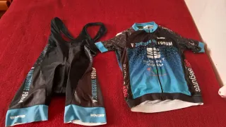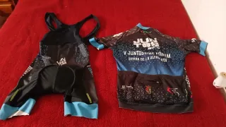 Conjunto de ropa de ciclismo con diseño deportivo. - Maillot de manga corta con cremallera completa. - Culotte con tirantes. - Logos de Juntosbike Forum, Seat y Vigilsa. - Detalles en azul y negro.Azul negra 40,verde 15,la azul 20,según si te llevas varios negociable