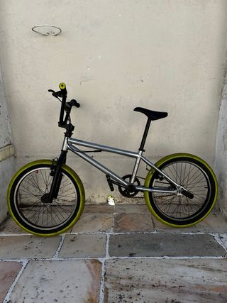 Bicicleta BMX de ruedas amarillas, esta en muy buenas condiciones y esta usada pocas veces, no tiene arañazos ni pegatinas puestas. Tambien tiene clavijas de BMX, funciona perfectamente