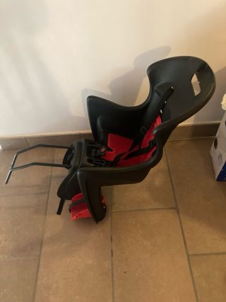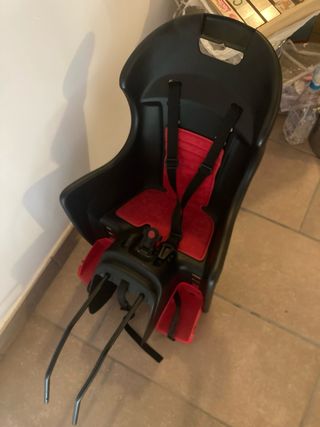 Asiento para bicicleta diseñado para transportar niños de forma segura. - Color negro y rojo. - Arnés de seguridad de 3 puntos. - Reposapiés ajustables.
