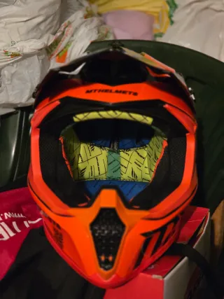 Casco de moto para niño en color naranja y negro. - Diseño deportivo. - Interior con forro acolchado. - Marca MT Helmets. Talla 54-56 cm - S