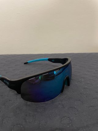 Gafas de sol deportivas Siroko con lentes espejadas. - Montura negra. - Varillas azules. - Lentes con reflejo azul. - Funda y recambios incluidos. (pequeño defecto en los cristales)