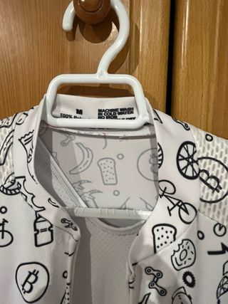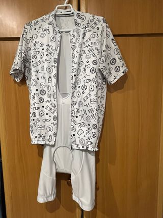 Conjunto de equipación de ciclismo compuesto por camiseta y culotte. - Camiseta de manga corta con estampado. - Culotte blanco. -Talla M