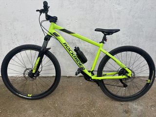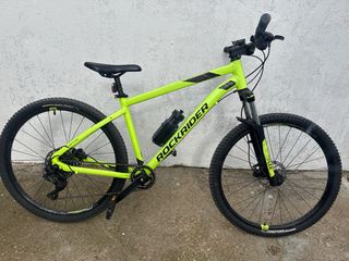 Bicicleta de montaña Rockrider en color amarillo brillante. - Cuadro de aluminio. - Ruedas de 27.5 pulgadas. - Frenos de disco. - Suspensión delantera. - Portabidón incluido.