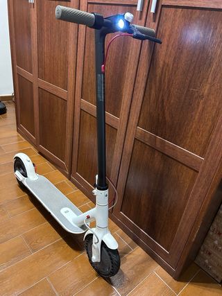 Patinete eléctrico Xiaomi en color blanco. Diseño moderno y funcional. - Ruedas anti pinchazos nuevas. - Frenos en perfecto estado. - Luces delanteras y traseras en perfecto estado. - Plegable para fácil transporte. - Batería al 100%. - Cargador original incluido . - No tiene caja. - Solo venta con recogida. El patinete está en perfecto estado y funcionamiento. Poco uso y bien cuidado. Único inconveniente tiene algunos arañazos en la solapa de la rueda trasera. Se pueden tapar con las pegatinas de customizar el patinete.