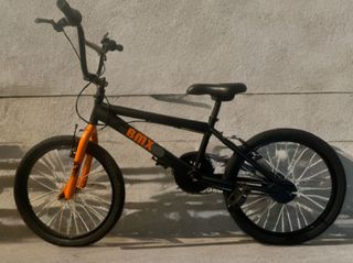 Bicicleta BMX con un diseño llamativo en naranja y negro. - Cuadro de color negro. - Horquilla delantera de color naranja. - Ruedas de 20 pulgadas.
