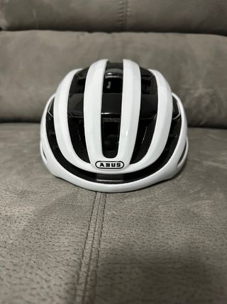 Casco de ciclismo ABUS Airbreaker en color blanco. Diseñado para ofrecer ventilación y comodidad. - Diseño aerodinámico. - Múltiples canales de ventilación. - Logotipo ABUS visible. - Nuevo a estrenar. - Proviene de Taiwan. TALLA M