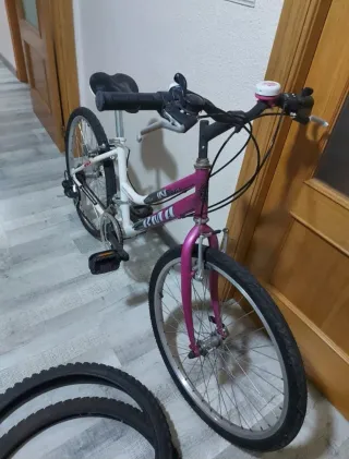 Bicicleta infantil de color rosa y blanco, ideal para iniciarse en el ciclismo. - Cuadro de aluminio. - Ruedas de 24X - Frenos V-brake. - Timbre rosa incluido.