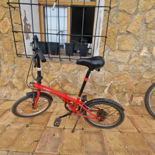 Bicicleta plegable de color rojo, marca B'TWIN. Ideal para desplazamientos urbanos o para llevarla contigo. - Cuadro plegable. - Ruedas de 20 pulgadas. - Frenos. - Sillín ajustable.