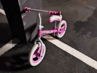 Bici de equilibrio rosa para niñas pequeñas, ideal para aprender a montar. - Color rosa. - Asiento naranja. - Ruedas blancas con llantas grises.