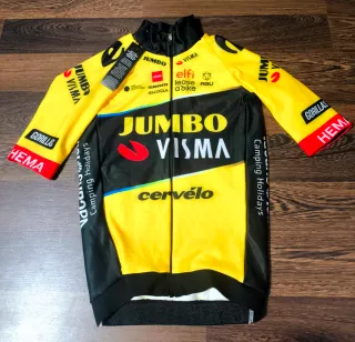 Maillot corto térmico afelpado profesional del equipo Jumbo Visma, nuevo a estrenar con etiquetas originales Ideal para combinar con manguitos en días de entretiempo Tejido mallado en axilas para mejor transpiración Es ropa del equipo pro. Tope gama Talla S. Es un tallaje estandard. Posibilidad entrega en mano entre Asturias y Bilbao. Consultar
