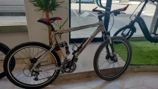 Bicicleta de montaña con doble suspensión. - Cuadro de aluminio. - Ruedas de 26 pulgadas. - Frenos de disco. - Amortiguador trasero. - Horquilla Rock Shox