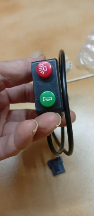 Componente para manillar de patinete eléctrico. -interruptor claxon/luces. - Incluye dos botones (rojo y verde). - Conector de cableado. - Diseño circular para el manillar.