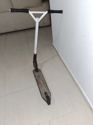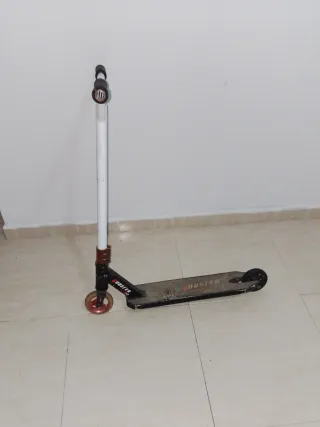 Patinete de la marca BOOSTER. - Ruedas de color rojo y negro. - Manillar blanco con empuñaduras negras.