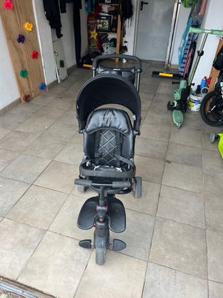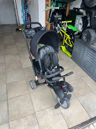 Triciclo Smartrike en color negro, ideal para el transporte de bebés. - Asiento acolchado con arnés de seguridad. - Capota para proteger del sol. - Empuñadura para el adulto. - Reposapiés. - Ruedas resistentes.