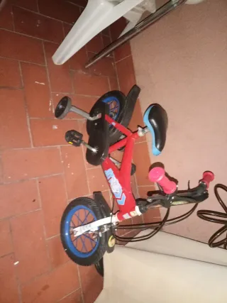 Bicicleta infantil de color rojo, ideal para los más pequeños. - Ruedines para mayor estabilidad. - Manillar con puños de goma. - Sillín azul y negro.