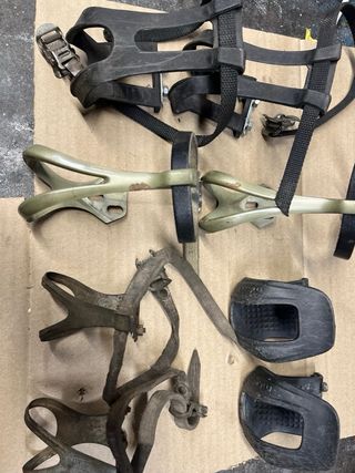 Conjunto de rastrales para bicicleta, ideales para mejorar la sujeción y el pedaleo. - Incluye varios pares de rastrales y correas. - Fabricados en metal y plástico resistente. - Diseños variados para diferentes tipos de pedales.