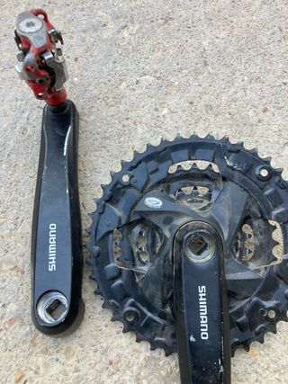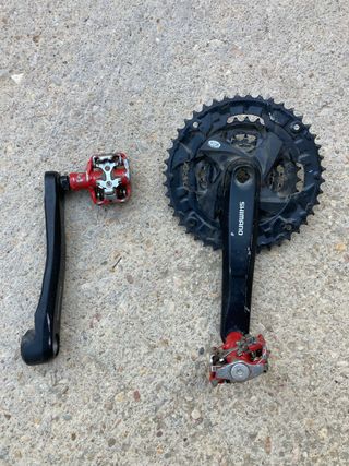 Pedales y bielas Shimano de montaña usadas, en buen estado. - Incluyen juego de bielas Shimano y un par de pedales automaticos - Tres platos de 44 a 22 dientes? - Piezas usadas, con señales normales de uso. - Ideales para reparar o actualizar tu bicicleta.