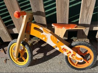 Bicicleta de equilibrio de madera con diseño divertido. - Marco de madera con detalles naranjas y blancos. - Ruedas naranjas. - Asiento naranja.