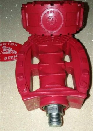 Hola vendo este juego de pedales de bicicleta antiguos, de color rojo intenso. Son dos pedales, con un diseño clásico de bmx. Ideales para restaurar una bici antigua o darle un toque retro a tu bicicleta. Marca NOTARIO - Fabricados en plástico resistente rojo y en España- Diseño clásico y llamativo. - Color rojo. - Perfectos para bicicletas clásicas.