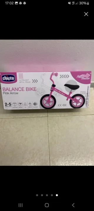 Bicicleta de aprendizaje marca Chicco, modelo Pink Arrow. - Color rosa. - Diseño sin pedales para facilitar el equilibrio. - Ruedas de goma. - Está bastante arañada en el manillar y algún lado más, De ahí su precio.Pero por lo demás genial.