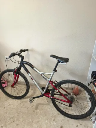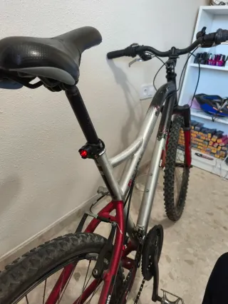 Bicicleta de montaña Aluminium 7005 con cuadro de aluminio y detalles en rojo. Ideal para adolescentes y adultos no muy altos. - Cuadro de aluminio. - Horquilla delantera roja. - Llantas negras. - Pedales plateados. - Luz roja trasera En la última foto se ve que le falta una carcasa del cambio. Pero funcionan.