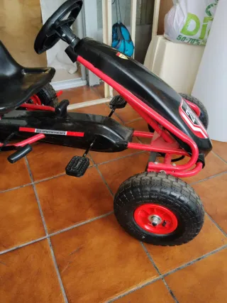 Coche de pedales con un diseño deportivo en rojo y negro. - Asiento negro. - Ruedas de goma y aire - Volante negro con detalle. - Pedales.