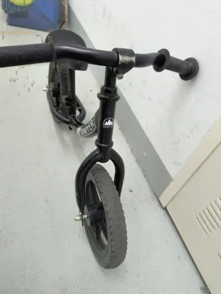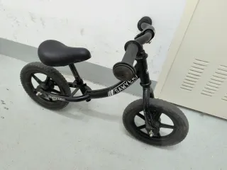 Bicicleta infantil sin pedales. Color negro y blanco. Cuatro ruedas. Manillar fijo. Asiento blanco. Presenta marcas de uso visibles en el asiento y en el manillar (ver fotos). Sin piezas sueltas ni roturas evidentes. Entrega en mano.