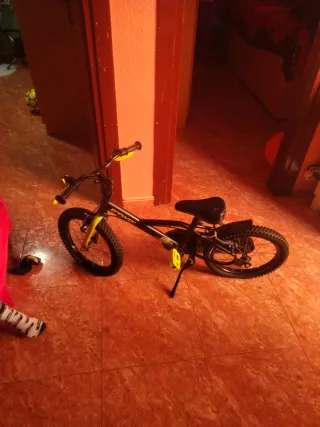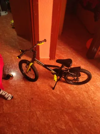 Bicicleta infantil BTWIN (Decathlon) - Tamaño: 16 pulgadas. - Color: naranja y negra. - Frenos delanteros y traseros. - Sillín regulable. - Cabellete incorporado. - Posibilidad de poner ruedines. Ideal para primera bicicleta con pedales. En muy buen estado, no requiere puesta a punto previa.